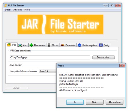 Abhängig von der Konfiguration und Art des Betriebssystems ist es nicht immer möglich das Java Archive mit einem Doppelklick zu starten. Der JAR File Starter löst dieses Problem, indem aus der JAR-Datei eine Executable erstellt wird, die beim Start alle benötigten Klassen & Ressourcen temporär entpackt und wie gewohnt in der Java-Umgebung startet.