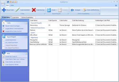 Mit JCodeGallery können Sie schnell und einfach Codes für VB.Net , C#, PHP, HTML ... verwalten. Der Code-Editor beherscht Syntax Hilighting, sodass Sie eine bessere Übersicht für ihr Codes haben. Sie können die Codes auch ganz einfach zur OnlineCodeGallery hinzufügen sodass jeder User zugriff auf dein Code hat.