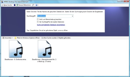 JMMG Desktop File Search Premium unterstützt Sie bei der Suche nach persönlichen Dateien auf Ihrem Computer. Dank Datenbankunterstützung können Sie Dokumente, Bilder, Musik und Videos, sowie beliebige weitere Dateien innerhalb von wenigen Sekunden finden und öffnen. Die Datenbank wird im Hintergrund aktualisiert, während das Programm verwendet wird - es wird kein Dienst installiert, der permanent nach Dateien sucht und so Ressourcen vergeudet.