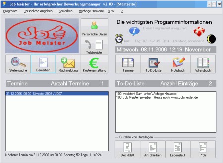 Der Jobmeister hilft Ihnen bei allen aufgaben der Stellensuche. Ob Erfassen der Daten aus dem besten Stellenbörsen mit einem Klick, dem Erstellen von Lebensläufen, Anschreiben, oder der Nachweis des Bewerbungsverlaufes gegenüber der Jobagentur, all dies leistet der Jobmeister. Export von Bewerbungen nach Word. Schneller reagieren, schneller wieder im Arbeitsleben. Punkten Sie mit den besten Bewerbungen.