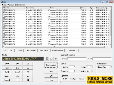 Jeder, der schon einmal versucht hat mehrere Dateien unter Windows umzubenennen, wird händeringend nach einem Tool wie Joe gerufen haben: Das Windows-Utility erlaubt komfortables Umbenennen jeglicher Dateien per Maske, Skript und/oder Zähler.