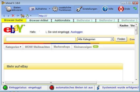bei eBay keine Auktion mehr entgehen lassen ist mit kAmel ist ganz einfach. Sie können hier Auktionen aufnehmen, während im Hintergrund ihre Gebote gleichzeitig abgegeben werden. Das Programm ist zudem ganz einfach zu bedienen. 3 Gebote können zur gleichen Zeit abgeben werden. Mit kostenloser SMS Benachrichtigung und Tippfehlersuche, damit sie auch Auktionen zu sehen bekommen, die ansonsten nicht so oft angezeigt werden.