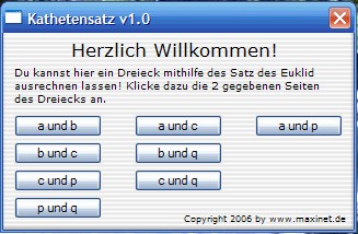 Mit diesem Programm können sie anhand 2 gegebener Seiten eines Dreiecks mithilfe des Kathetensatzes (Satz des Euklid) die Restlichen 3 Seiten berechnen lassen.