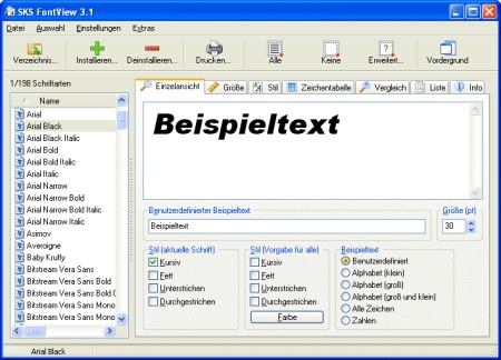 Zeigt zu allen installierten und nicht installierten TrueType, OpenType und PostScript Type 1 Fonts Schriftproben wie z.B. das ABC, einen Benutzertext oder den kompletten Zeichensatz. Die Schriftprobe kann formatiert werden. Schriften können installiert und deinstalliert werden. Eine Liste mit allen Schriftproben oder einer Auswahl aus diesen kann gedruckt oder angezeigt werden. Möglichkeit bis zu fünf Schriften miteinander zu vergleichen.