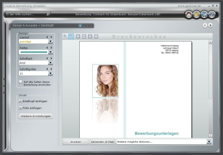 Mit dem Programm erstellen Sie Deckblatt, Anschreiben und Lebenslauf individuell und mit modernem Personal Design (16 Standard- und Premium-Designs). Weitere Highlights: Automatische Datenerfassung durch Einfügen kompletter Stellenanzeigen, über 1000 Sätze für das Anschreiben, Individualisierer, integrierter E-Mail-Versand, Umwandlung in PDF, Kostenverwaltung, Bewerbungstipps u.v.a.m.