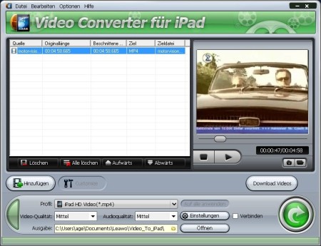 Kinderleichte und professionelle HD Video-Konvertierung: Wandeln Sie nahezu jedes gängige Video und vor allem auch die hochauflösenden HD-Formate iPad-kompatibel um. Egal, ob DVDs, Musikvideos, TV-Aufnahmen oder Flimclips – mit dem Leawo Video Converter für iPad machen Sie aus Ihrem iPad ein Kino. Alle iPad-Formate und diverse Auflösungen: mpeg-4, mov und H.264. In Sachen Videokonvertierung für alle Fälle rundum abgedeckt sein!