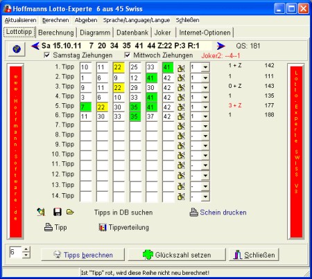 Berechnet optimierte Lottoscheine mit Datenbank der Ziehungen, Aktualisierung über Internet, Viele Statistische Auswertungen und Parameter für die Berechnung, statistische Auswertungen, Berechnung von Tippscheinen mit bis zu 14 Tipps und Ausdruck direkt auf den Schein, Lottoscheindruck ist möglich.