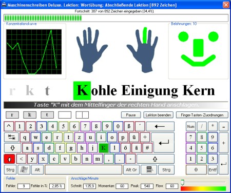Dieses Programm lehrt in 22 Lektionen das Zehnfingersystem. Für abwechslungsreiches und effektives Training sorgen sechs unterschiedliche Lektionstypen und detaillierte Ergebnisanalysen. Als besonderes Feature lädt das Programm bei vorhandener Internet-Verbindung Nachrichten aus RSS-Feeds in verschiedenen Sparten herunter und bietet diese in aufbereiteter Form zum Abtippen an.