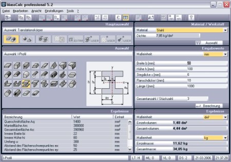 MassCalc professional ist ein Berechnungsprogramm für Ingenieure und Techniker, welche öfters Masseberechnungen mit Stahl-Profilen nach DIN, Blechen und sonstigen geometrischen Körpern durchführen müssen. Außerdem können Sie aus über 750 Materialien bzw. Werkstoffen auswählen. Es besteht die Möglichkeit, benutzerdefinierte Profile, Tafeln, Teile und Materialien anzulegen und zu editieren.
