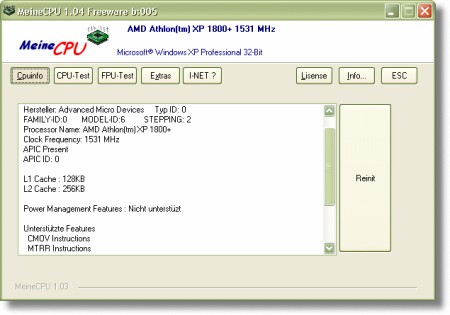 MeineCPU zeigt Ihnen Informationen über Ihren Prozessor an, beinhaltet einen CPU/FPU Test, Druckfunktion und CPU-BOMBER, der sich sehr gut zum Testen der CPU und deren Kühlung eignet.