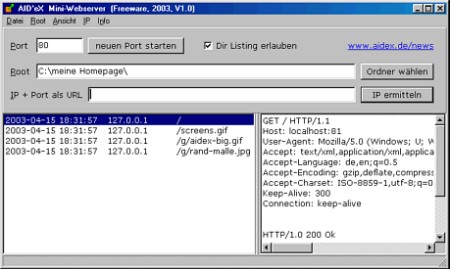 HTTP-Webserver für privates Homepage-Hosting oder Bereitstellung großer Dateien. Passwort-geschützte Verzeichnisse möglich, Directory-Listing (Index-Service), partielle Downloads, Dateien bis 2 GB, HTTP-Header-View, Ermittlung der eigenen IP (Weitergabe als Link an Freunde), Chat-Funktion, Webcam-Funktion, schnelle Engine, einfache Bedienung sogar für Einsteiger geeignet, Tray-Icon, Resourcen-schonend. Läuft ohne Installation in jedem Verzeichnis.