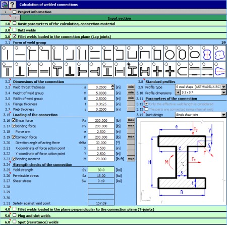 Die Berechnung ist für den geometrischen Entwurf und die Festigkeitsprüfung der belasteten Schweißverbindungen von Maschinenkonstruktionen, gefertigt aus Kohlenstoffstahl, bestimmt. Das Programm ermöglicht den Entwurf von mehr als den 50 häufigsten Ausführungen der Schweißverbindungen, die durch verschiedene Belastungskombinationen beansprucht werden.