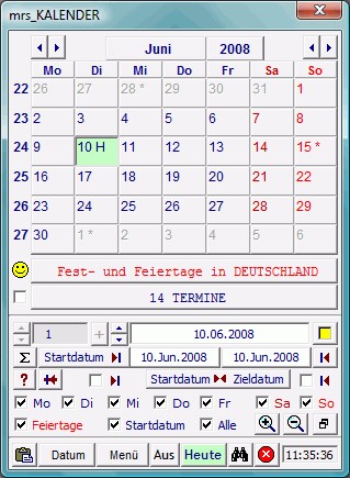 mrs_KALENDER mit Feiertags- und Terminliste. Erstellt und druckt Excel-Arbeitsmappen mit Jahres-, Monats-, Wochen- und Arbeitswochenkalender. Berechnung von Datumsdifferenzen, Datum in Excel-Tabellen eintragen/suchen. mrs_TERMIN 4.3: Terminplaner mit Alarmfunktion für mehrere Termindateien (z.B. für Geburtstage, geschäftliche Termine usw.). Vielfältige Auswertungsmöglichkeiten. mrs_FEIERTAGE berechnet Feiertage für D, A und CH