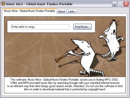 Das Programm \"Music Mice - Global Music Finders Portable\" assistiert Ihnen bei der Suche nach kostenloser Musik in den Formaten MP3, OGG, WMA und MP4. Das Programm hilft Ihnen, indem es Ihre Suchanfrage durch spezielle Parameter verfeinert - die meist zu guten Ergebnissen führen - und dann einfach an Google und Ihren Standardbrowser weitergibt. Achtung: Benutzen Sie dieses Programm nicht, um Links zu urheberrechtlich geschützten Werke zu finden.