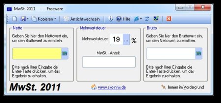 Berechnen Sie schnell und einfach Brutto- und Nettowerte. Lassen Sie sich den Mehrwertsteueranteil anzeigen. Ideal für Menschen, die viel mit Netto- und Bruttopreisen arbeiten. Das Programm kann nun immer im Vordergrund bleiben, wenn es dort benötigt wird.