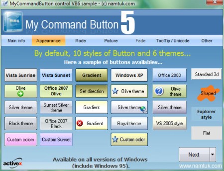 Integrieren Sie in Ihre Anwendungen mit diesem sehr schnellen und zuverlässigen Button fabelhafte visuelle Stile in allen Windowsversionen. Erhalten Sie alle Stile (Windows XP, Office 2003, Visual Studio 2005, 3D standard, Flat, Explorer,...) die die XP-Themen (Blue, Olive, Silver) unterstützen. Toggle und DropDown werden unterstützt, die Themen werden automatisch erkannt...
