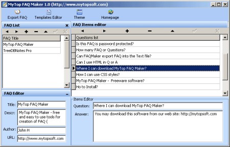 MyTop FAQ Maker ist ein Programm zum erstellen von FAQ (Frequently Asked Questions / Häufig gestellte Fragen). Es können beliebig viele Fragen und Antworten erstellt werden und mit Designvorlagen in HTML, XML und TXT ausgegeben werden. 10 Vorlagen sind bereits enthalten.