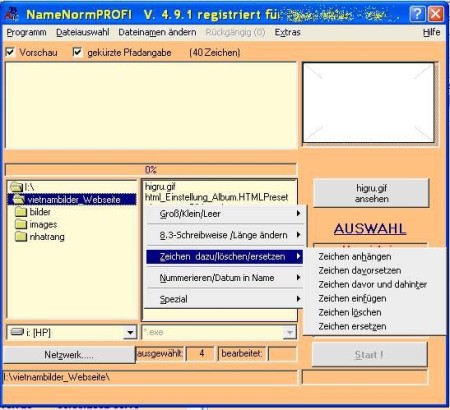 Über 30 Dateinamen- Manipulationen möglich. Auch in Unterverzeichnissen. Attributänderungen möglich. Bis 100 UNDO- Schritte. Geeigent zum Gleichschreiben, Umbenennen oder Archivieren. Durchnummerieren möglich, als Dateiname auch Datum möglich. Diese Funktion ist insbesonders für Bilderarchivierung nützlich.
