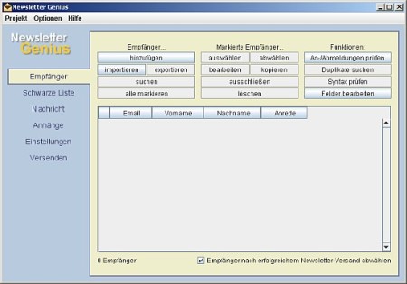 Mit Newsletter Genius versenden Sie Newsletter, Pressemitteilungen und andere Serienmails im HTML-, Text- oder Multipart-Format. Das Programm deckt mit seinem Funktionsspektrum den gesamten Versandprozess ab - angefangen beim Import von Empfängerdaten über die Erstellung einer auf Wunsch personalisierten Nachricht bis hin zur Behandlung von Rückläufern sowie An- und Abmeldungen seitens der Empfänger. Eine Komplettlösung mit vielen Funktionen.
