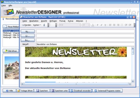 Der NewsletterDesigner ermöglicht das Erstellen von professionellen Newslettern und Werbemails mit einem minimalen Arbeitsaufwand. Sie erstellen kinderleicht Ihre professionellen Newsletter-Vorlagen und verwenden diese immer wieder für Ihren aktuellen Newsletter. Erstellen von professionellen HTML (Rich Media) Newslettern. Einbindung von Grafiken. (Kopfgrafik, Trenngrafik, Impressum-Grafik) Erstellen von Textblöcken für die Newslettermeldungen.