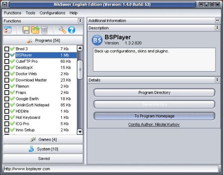 Das Programm NikSaver erlaubt ihnen ihres Arbeitsmedium leicht zu speichern: angefangen mit Programm-Einstellungen, Spiele, Operationssystem bis zum Arbeirsplatz, Adressenbuch und privater Korrespondenz.