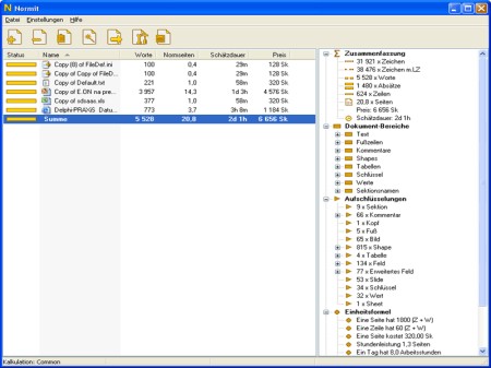 Programm ermittelt detaillierte Statistik für doc, xls, ppt, html, ini, txt Dataeien, berechnet Honorar, schätzt die notwendige Projektdauer ab. Egal ob eine oder hundert Dateien auf einmal. Deutsch, English, Slowakisch. Für jeden Übersetzer, jedes Übersetzungsbüro.
