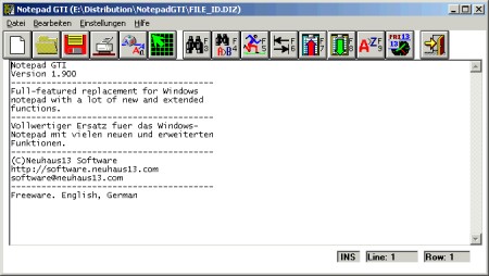Vollwertiger Ersatz für den Windows-Texteditor mit zahlreichen Zusatzfunktionen, wie Zeilen- und Spaltenzähler, wählbare Vorder- und Hintergrundfarben und Zeichensätze, einstellbarer Zeilenumbruch, Suchen und Ersetzen, Druckvorschau, Einsetzen von Datum und Uhrzeit, Einsetzen von Zeichen aus einer Zeichensatztabelle, bequeme Benutzung der Zwischenablage, einstellbare Dateifilter usw.
