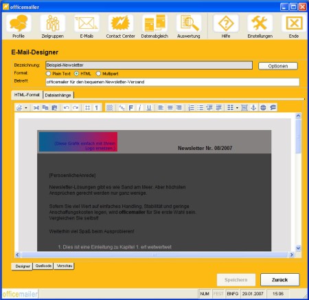 Die E-Mail ist das wachstumsstärkste Direktmarketing-Instrument. Neben den günstigen Kosten liegt das vor allem an ihrer Effizienz.Jetzt können Sie optisch anspruchsvolle Newsletter mit wenigen Klicks selbst erstellen und zuverlässig versenden.Überzeugen Sie sich vom officemailer:- Bewährte und ausgereifte Technologie (über 300 Businesskunden) - Schnell erlernbare Benutzeroberfläche - Keine Programmierkenntnisse notwendig