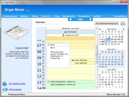 Vergesslichkeit liegt in der Natur des Menschen - doch Termine zu vergessen gehört jetzt der Vergangenheit an! Orga-Nicer ist die umfassende, einfach zu bedienende Lösung zur Terminplanung. Mit akustischen und visuellen Signalen erinnert die Software an wichtige Termine, verwaltet Ihre Notizen (optional direkt auf Ihrem Desktop), speichert Ihre Passwörter und sorgt mit einem virtuellen Kalender für den vollen Überblick über Ihren Tagesablauf.