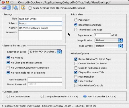 100 % Adobe kompatibel, PDF Kompression bis zu 90 %, Zuweisen von Dokumenteninformationen, Definition der Dokumentensicherheit, Steuerung der Präsentationseigenschaften beim Empfänger, Steuerung des Acrobat Reader beim Empfänger: Werkzeugleiten einblenden, ausblenden, Lesezeichen anzeigen ja/nein, Schaffung von Abwärtskompatibilitäten zwischen Adobe FormDesigner Formularen und den Adobe 7, 6 und 5 Standards