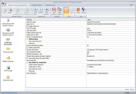 Mit PDF Render Center (PDF Server) wandeln Sie Dokumente auf einem Server in PDF um und organisieren PDF-Workflow. Diese Dokumente stehen dann in Back-End-Systemen, zur Verwaltung in Ihren Dokumenten-Management-Systeme zur Verfügung. Es gibt mehrere Möglichkeiten für den Datentransport und Dokumentenverwaltung: Ordner-Überwachung, E-Mail-Client, virtuelles Laufwerk, Web-Server, Netzwerkdrucker. MS Office-Metainformationen werden mit übernommen.
