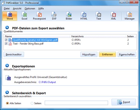 PdfGrabber ermöglicht den Export von Inhalten aus PDF-Dokumenten in verschiedene Formate,z.B. Excel, Word / RTF, Powerpoint, Text oder DXF / AutoCAD. PdfGrabber gestattet somit die Bearbeitung und Weiterverarbeitung von PDF-Inhalten in anderen Anwendungen wie z.B. Microsoft Word, Microsoft Excel oder Powerpoint, ohne das Adobe Acrobat installiert sein muss. Ein PDF-Drucker hilft bei der Rückumwandlung in PDF.