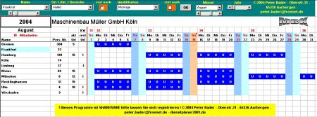 PEP 2001 ist ein umfangreiches Programm zur komfortablen Personal - Einsatz - Planung - in MS xcel ab Version 8,0 Monatsplanung , Fehlzeitenverwaltung und Urlaubsplanung in Betrieben aller Branchen,Für die Bedienung liegt eine ausführliche Info ( Info.xls ) Datei dem Programm bei. Wichtige Merkmale: Datenverwaltung von beliebig vielen Mitarbeitern Individuelle festlegung der Regelarbeitszeit, - 5 , 5,5 , 6 , 7 , Tage Woche usw