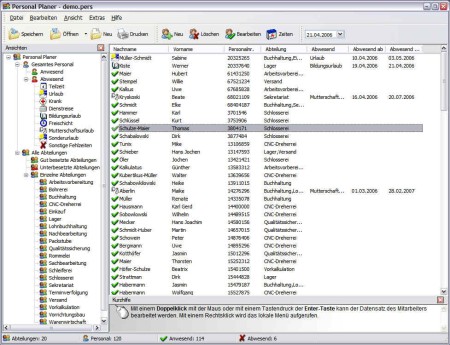 Der Personal Planer hilft bei der Beantwortung folgender Fragen: Welche Mitarbeiter sind derzeit oder zu einem beliebigen anderen Zeitpunkt anwesend? Was ist der Grund der Abwesendheit? In welchen Abteilungen droht Personalmangel? Mit der integrierten Statistikfunktionalität kann leicht ermittelt werden, welche Abteilungen einen hohen Krankenstand aufweisen.