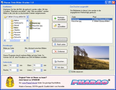 Druckt 1 bis 4 Bilder auf einer DIN A4 Seite. Die Bilder werden automatisch zentriert ausgerichtet und in der Größe geändert, dass die Bilder nicht größer als eine Seite sind. Mit diesem Programm kann ein ganzes Verzeichnis mit Bildern ohne Aufwand als Fotoalbum gedruckt werden. Der Ausdruck kann auf kostengünstigen DIN A4 Normalpapier oder hochwertigen Fotopapier erfolgen.
