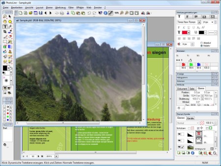 PhotoLine ist Bildbearbeitung, Bildübersicht, Layoutprogramm, Vektoreditor, Batchkonverter und Webbildbearbeitung mit vielen Funktionen in einem Programm. Im Bildbearbeitungsbereich werden vollständig Lab, CMYK, 16 Bit Farbtiefe pro Kanal, ICC-Profile und Rawdaten von Digitalkameras unterstützt. Daneben bietet PhotoLine alle nötigen Funktionen wie Malen, Kopierpinsel, Filter, Verlauf und Flußfüllen, Spezialeffekte wie Strudel, Schatten, Glühen, Verzerren, Morphen, 3D-Projektion. Arbeitsebenen, Beschnittebenen, dynamische Ebeneneffekte. Unterstützt werden auch EXIF- und IPTC-Daten. Mehrstufiges Undo/Redo, Plugin Filter und vieles mehr. Es werden viele Bildformate unterstützt.