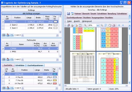PlattenEco berechnet Schnittpläne mit möglichst wenig Verschnitt für beliebige Zuschnitte und Rohlinge. Das Ergebnis wird grafisch dargestellt, für jeden Rohling gibt es einen Schnittplan und eine Schnittfolgeliste, Listen der Zuschnittpositionen und Stücklisten. Es können Daten aus Dateien oder der Zwischenablage importiert werden, wobei die Spaltenbelegung anpaßbar ist und für mehrere Importe gespeichert werden kann.