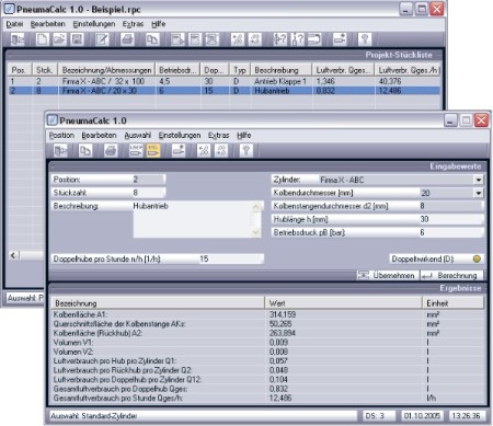 PneumaCalc dient zur komfortablen Berechnung des Gesamtluftverbrauchs von Maschinen und Anlagen, in denen (besonders viele) Pneumatik-Zylinder bzw. Pneumatik-Antriebe zum Einsatz kommen. Diese werden übersichtlich in einer editierbaren Stückliste dargestellt. Verwenden Sie bei Ihren Berechnungen Pneumatik-Zylinder aus der integrierten, Hersteller-übergreifenden Zylinder-Datenbank oder erstellen Sie bei Bedarf benutzerdefinierte Zylinder.