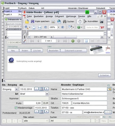 Mit dem Postbuch können Sie schnell und einfach Ihren Posteingang und Ausgang verwalten. Briefe, Einschreiben, Einschreiben mit Rückschein, Express, Pakete, Päckchen, Faxe und eMails werden unterstützt. Eine Projekt- und Mitarbeiter-Zuordnung ist möglich. Die Wiedervorlage und Terminverwaltung sorgt für den ständigen Überblick. Viele Listen stehen für unterschiedliche Ausdrucke zur Verfügung.