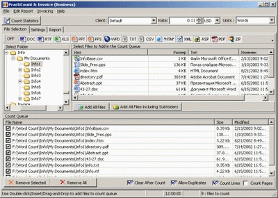 PractiCount and Invoice ist ein Textzaehl- und Rechnungs-Software fuer Uebersetzer, Phonotypisten, Bueros, Autoren. Es kann auch Gruppen von mehrern Word-, PowerPoint-, Excel-, WordPerfect-, HTML- und PDF-Dateien zaehlen. Einstellbare Wort-, Zeilen-, Seitenzaehloptionen ermoeglichen die Einstellug der Zeilen- und Seitenparametern nach der Wort- o. Zeichenzahl. Zaehlen in Textfeldern, Kopf- und Fusszeilen, Fuss- und Endnoten sowie Anmerkungen.