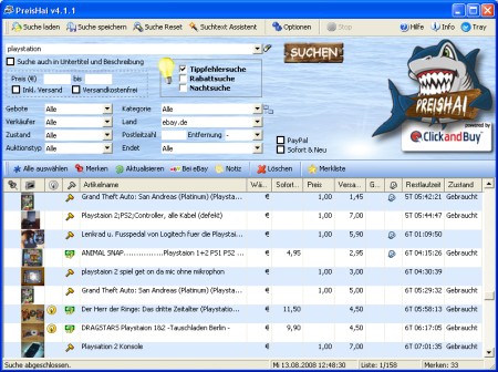 PreisHai ist ein Tool speziell zur Schnäppchensuche auf eBay. Der Knüller ist die integrierte Tippfehlersuche! Hiermit sucht PreisHai gezielt nach Angeboten, die vom Verkäufer falsch geschrieben wurden. Die ausgefeilten Suchfunktionen von PreisHai bieten größtmögliche Flexibilität bei einfachster Bedienung. Über die intuitiv gestaltete Oberfläche finden Sie schneller die richtigen Angebote, als mit einem herkömmlichen Browser.