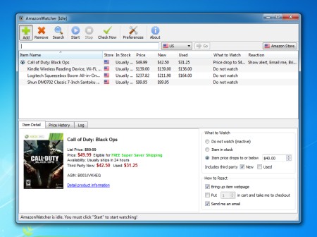 Mit PriceWatcher kann man die Preise und die Verfügbarkeit von Artikeln beim Online-Shop von Amazon überwachen. Ist der gewünschte ausverkaufte Artikel wieder verfügbar oder fällt ein Produkt unter einen selbst festgelegten Preis, so wird man von Programm benachrichtigt, auf Wunsch auch per eMail.