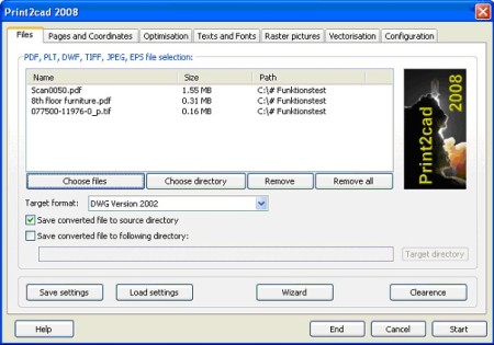 Print2CAD 2008 ist ein Konverter, mit dem PDF-, PDF/A-, DWF-, TIFF-, JPEG-, PLT (HPGL)- und EPS (PostScript)-Dateien in eine DWG-, DXF- bzw. DGN-Datei konvertiert und dann in ein beliebiges CAD-System eingelesen und dort bearbeitet werden können. Print2CAD 2009 kann sowohl als ein selbständiges Programm, das direkt ausgeführt werden kann als auch als eine AutoCAD Applikation erworben werden.