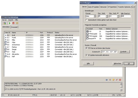 Benutzerfreundliche und funktionsfähige FTP Server Software. Unterstützt FTP, FTPS (FTP über SSL/TLS gesicherte Leitung. Explicite & Implicite Modi) und SFTP(Secure FTP on SSH2) Protokolle. Einige Eigenschaften: ergonomisch und sehr einfach in der Benutzung, hervorragende Geschwindigkeit und Stabilität dank gefädelter Architektur (Multi threading), Anzahl der Benutzerkonten nicht limitiert, Virtuelle Verzeichnisse, Ratios und vieles mehr.