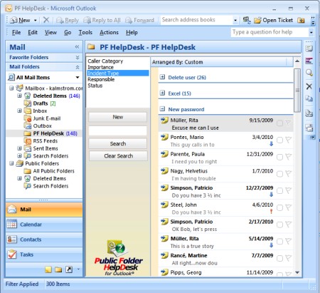 Public Folder HelpDesk unterstützt Ihr Arbeitsteam gemeinsame Projekt und Fragen effizient zu bearbeiten und zu verwalten. Auf Kundeninformation, Problembeschreibung, Bearbeitungsstand, Lösungen und Zeitaufwand etc. werden alle in dem Ticket vermerkt. Sie können nach Typ, Kategorie, Wichtigkeit und Fälligkeitsdatum geordnet werden. Dies wird Ihrem Arbeitsteam die Qualität von Dienstleistungen liefern, die Ihre Kunden erwarten und begrüßen werden.
