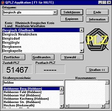 Die Postleitzahlen von Deutschland werden mehrfach im Jahr aktualisiert, mit QPLZ finden Sie immer die aktuellen Werte. Zusätzlich zu den aktuellen Postleitzahlen bietet das Programm folgende Vorteile: Anzeige der Telefonvorwahlen, des Bundeslandes, der Kreiszugehörigkeit, der Postleitzahlen aller Großkunden sowie die Ortssuche nach Eingabe der Postleitzahlen.