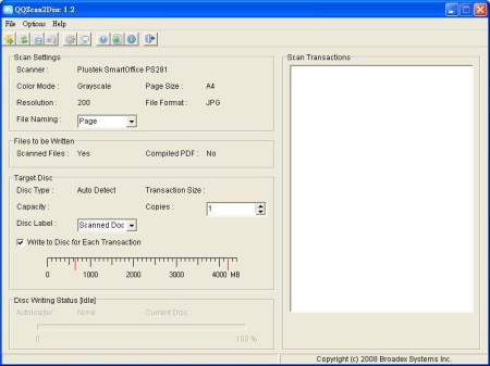 QQScan2Disc ist eine Software die automatisch mehrere Seiten einscannt und in eine PDF-Datei konvertiert und automatisch auf eine CD/DVD brennt (Hotkey Funktion wird unterstützt). Falls die eingescannten Dateien die Speicherkapazitäten der Medien (CD/DVD) übersteigt, so werden die Dateien automatisch aufgeteilt und auf die nächste CD/DVD gebrannt.