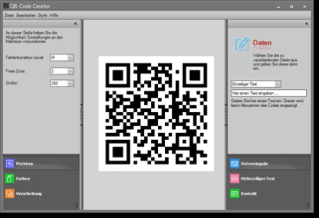 Erstellen Sie Ihre eigenen QR-Codes, sogar in Farbe und div. Größen. Exportieren Sie die QR-Codes über die Zwischenablage in nahezu jede Windows-Anwendung oder als Grafikdatei im JPG-Format. Optional kann auch das eigene Logo in den Code eingefügt werden. Generieren Sie QR-Codes für: einzeilige Texte, Links, Telefonnummern, SMS, Skype, Facebook, Twitter, Google+, Instagram, Tumblr, About.me, mehrzeilige Texte und Visitenkarten.