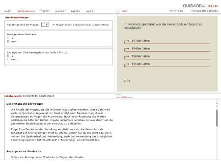 Mit der Quiz Software Quizmodul Basic können Sie eigene Quiz-Spiele erstellen und auf Ihrer Homepage veröffentlichen. Sie benötigen keine Programmierkenntnisse und keine Datenbanken oder spezielle Servervoraussetzungen. Alle Daten zur Veröffentlichung Ihres Online-Quiz im Internet werden Ihnen mitgeliefert und die notwendigen Arbeitschritte erklärt.