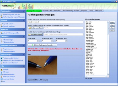 RankWare optimiert vorhanden Internetseiten auf Suchmaschinen ohne Eingriff in das Design. Die Software erzeugt frei gestaltbare Rankingseiten oder Doorwaypages. Freie Wahl der Optimierungsquelle mit Keyword vorschlägen.